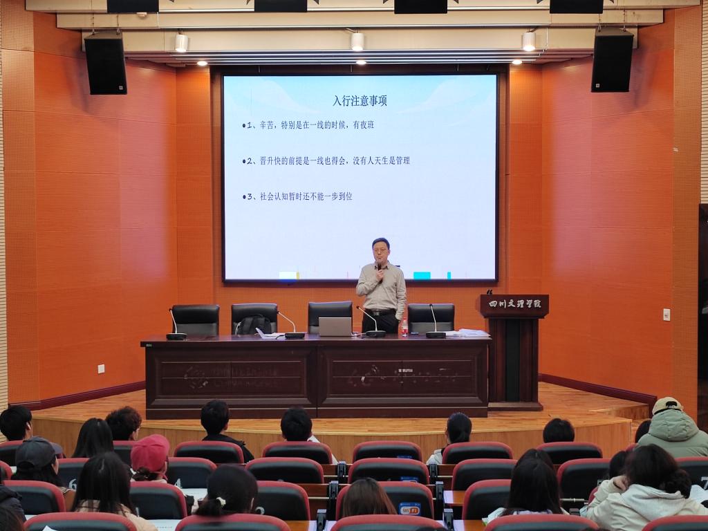 3月20日,suncitygroup太阳集团邀请四川华羽同创教育科技有限公司总经理吴平超在学术报告厅B厅为老年服务管理专业员工开展了就业专场讲座。公司学工办主任周宏星、兼职辅导员冯琴出席,2022级、2024级养老服务管理专业同学参与此次活动。