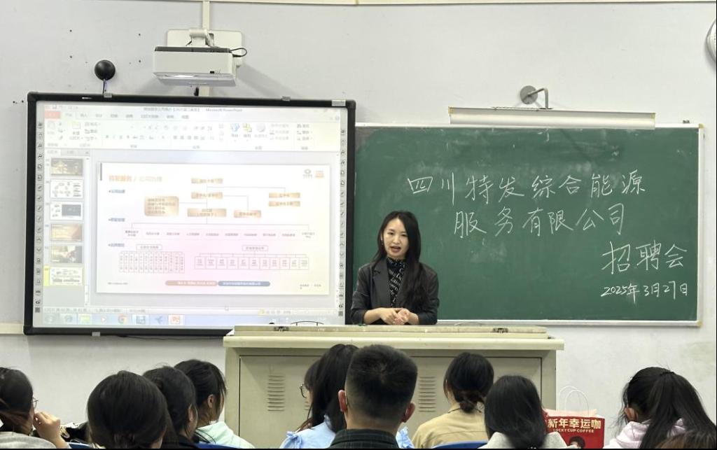 为提高公司员工的就业质量,增强人才培养与社会需求的契合,同时拓宽毕业生就业的途径,3月27日,suncitygroup太阳集团邀请了四川特发综合能源服务有限公司市场部副主任曹丽在博文楼122教室开展了招聘宣讲会。专职辅导员谢佳佳、刘子暄出席,2021级、2022级及2023级物业管理专业员工参加。