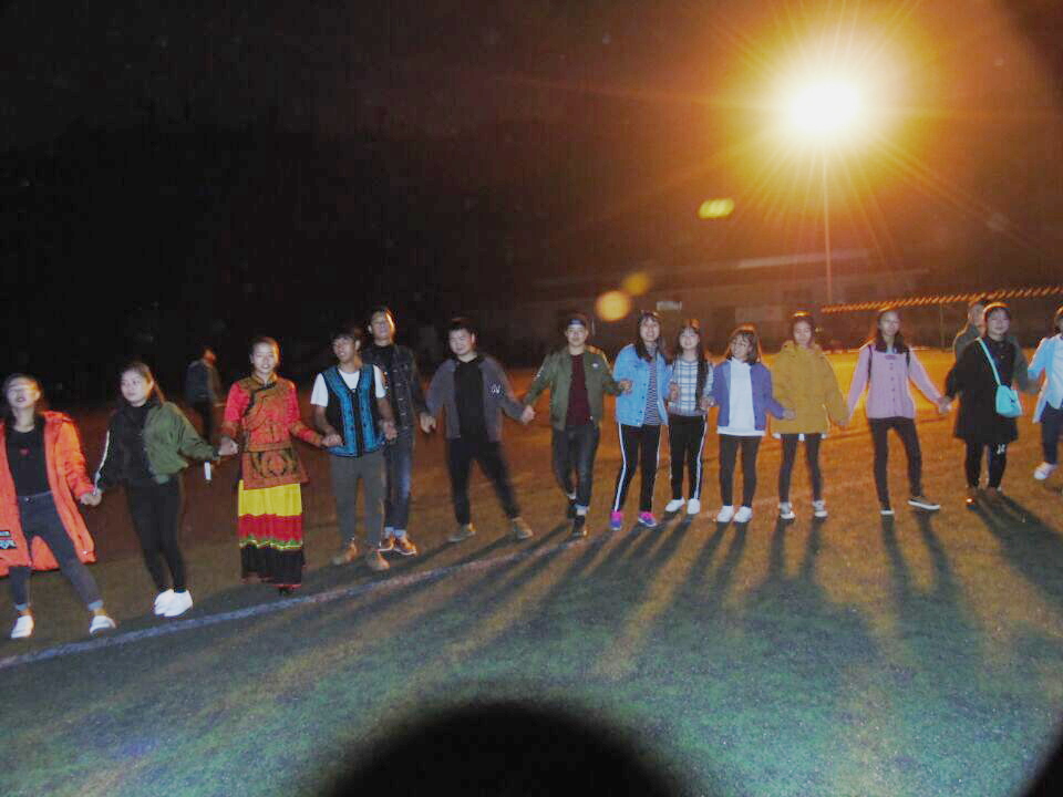 落日西沉,夜色将倾,彝族同学在操场上围成一圈席地而坐,同其他兄弟民族员工热情交谈。新年联谊歌会在《东山美人》中拉开序幕,彝族同学一同放声歌唱,悦耳动听的歌声缭绕不息,操场上爆发出一阵热烈的掌声。《阿依妞妞》、《索玛花》、《带我到山顶》、《姐姐》一曲曲优美的原生态歌曲把彝族新年联谊歌会一次又一次地推向高潮。最后,所有人手牵手跳起了欢快的达体舞,大家在欢笑声中度过了一个美好而又难忘的彝族新年。