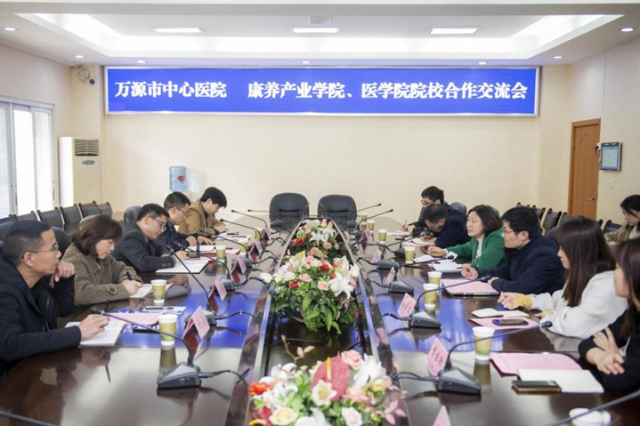 彭时敏从公司的建设历程、发展现状以及未来前景三个方面对公司的基本情况进行了介绍,希望院校双方能达成深度合作、实现优势互补、互利共赢。万源市中心医院经理石庆明从医院基础设施、运营能力、基地建设、科研教学、团队建设、所获荣誉等方面进行了介绍,并讲解了集医疗、康养于一体的康养产业基地建设及医院发展战略的总体思路。褚延鹏从专业人才培养、团队队伍建设、科研平台共建等方面出发,介绍高校与医院开展医教研领域合作模式。张俊浦针对万源市康养产业基地建设,提出可行的人才培养方案。万源市中心医院副经理李亚琼针对科教规划、经费投入、技术水平等方面对医院情况进行了补充介绍。康养产业医公司、医公司与万源中心医院其他领导及教师代表踊跃发言,充分交流了合作思路。