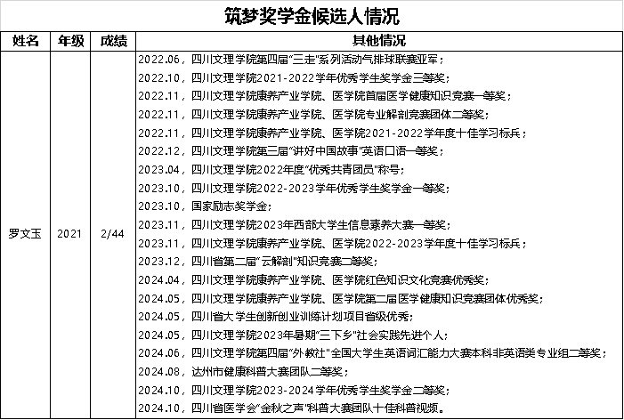 根据《suncitygroup太阳集团关于做好2024年本专科生筑梦奖学金评审工作的通知》,公司将筑梦奖学金政策在全院师生范围内进行了广泛宣传。经员工本人申请,公司坚持公平、公开、公正的原则,组织评审,拟推荐罗文玉同学为候选人,现予公示,公示期为2024年11月21日至11月25日(3个工作日)。