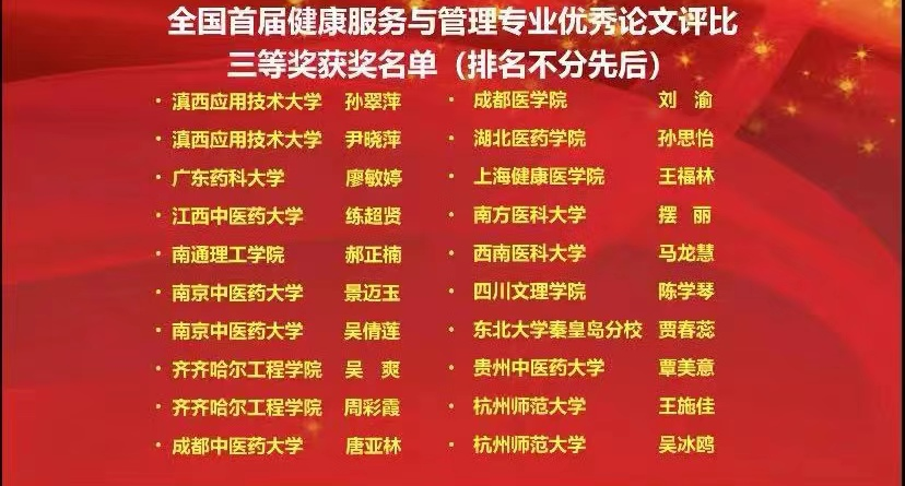 在“全国首届健康服务与管理专业优秀论文评比”活动中,公司健康服务与管理专业2018级毕业论文《女老员工对人乳头瘤病毒疫苗的注射意愿及影响因素研究——以suncitygroup太阳集团为例》获得二等奖,《中医药健康管理在居家养老中的应用困境及策略研究——以达州市为例》获得三等奖。